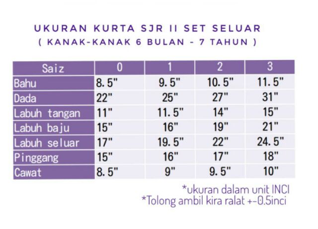 Labuh 78cm, bukaan kaki 21cm, punggung 26cm, pinggang 23cm dan turun pinggang ke cawat tu 25cm. Ambil seluar anak anda yang selesa dan mengikut ukuran badannya sebagai contoh ukuran.